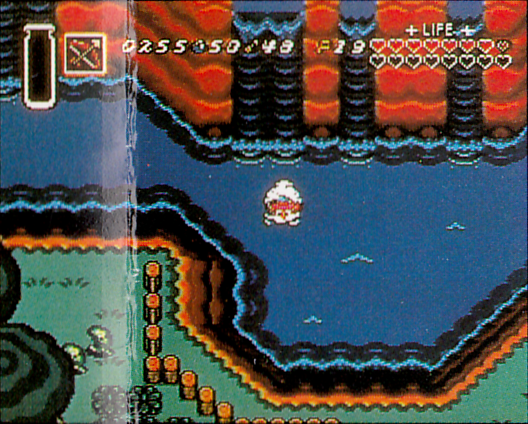 Terra says: In all three of the preceding prerelease screenshots the icons for rupees, bombs, and arrows are next to the number instead of above them like in the final version. Heart containers are in rows of 8 instead of 10, and a key count shows up in the overworld (in the final game, it only appears in the dungeons). Also, the word LIFE is surrounded by dashes in the final game, not the plus signs here.